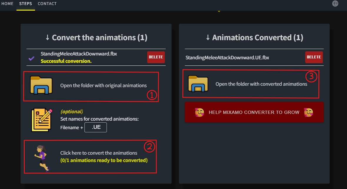 - 우측에 Open the folder with converted animations 폴더 확인